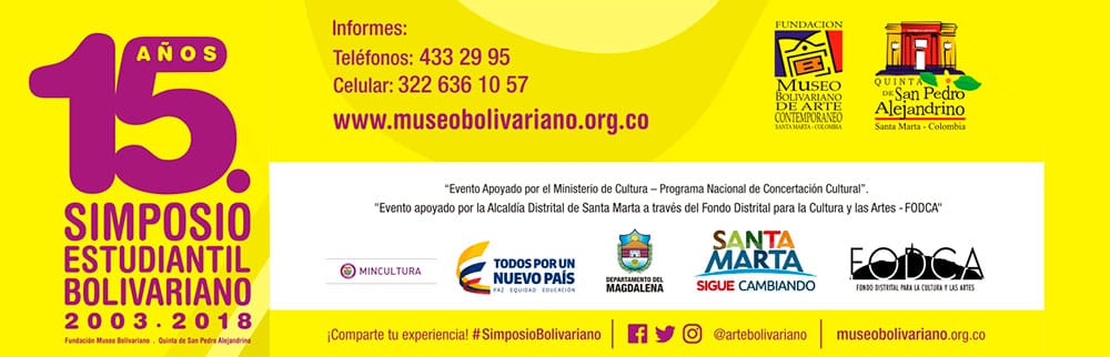 El XV Simposio Estudiantil Bolivariano es evento que integra la programación de la Fundación Museo Bolivariano de Arte Contemporáneo-Quinta de San Pedro Alejandrino, que cuenta con el apoyo del Ministerio de Cultura y su Programa Nacional de Concertación Cultural y la Alcaldía Distrital a través del Fondo Distrital para la Cultura y las Artes-Fodca.