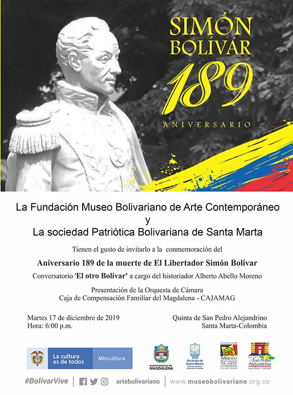Este martes 17 de diciembre desde las 6:00 de la tarde, organizado por la Fundación Museo Bolivariano de Arte Contemporáneo y la Sociedad Patriótica Bolivariana de Santa Marta.