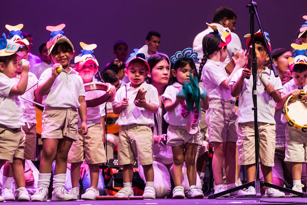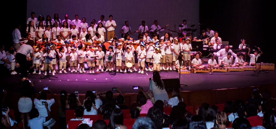 más de 100 estudiantes del primer semestre de 2018 que demuestrán sus habilidades musicales, adquiridas durante 40 horas de formaciòn disciplinada, bajo la supervisiòn de docentes ampliamente capacitados.