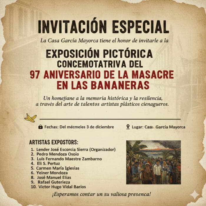 La Casa García Mayorca tiene el honor de invitarle a la exposición pictórica conmemorativa del 97 Aniversario de la Masacre en las Bananeras. ( Portada ©Foto @agendasamaria)