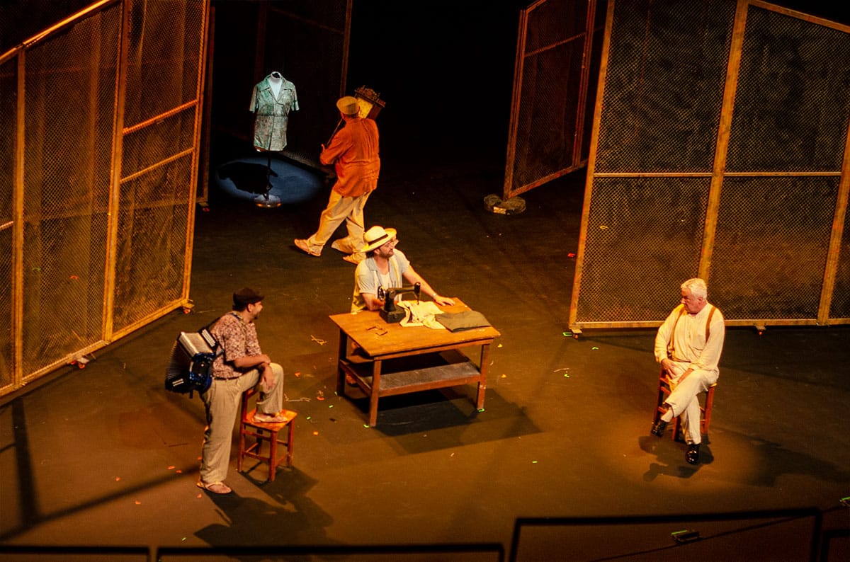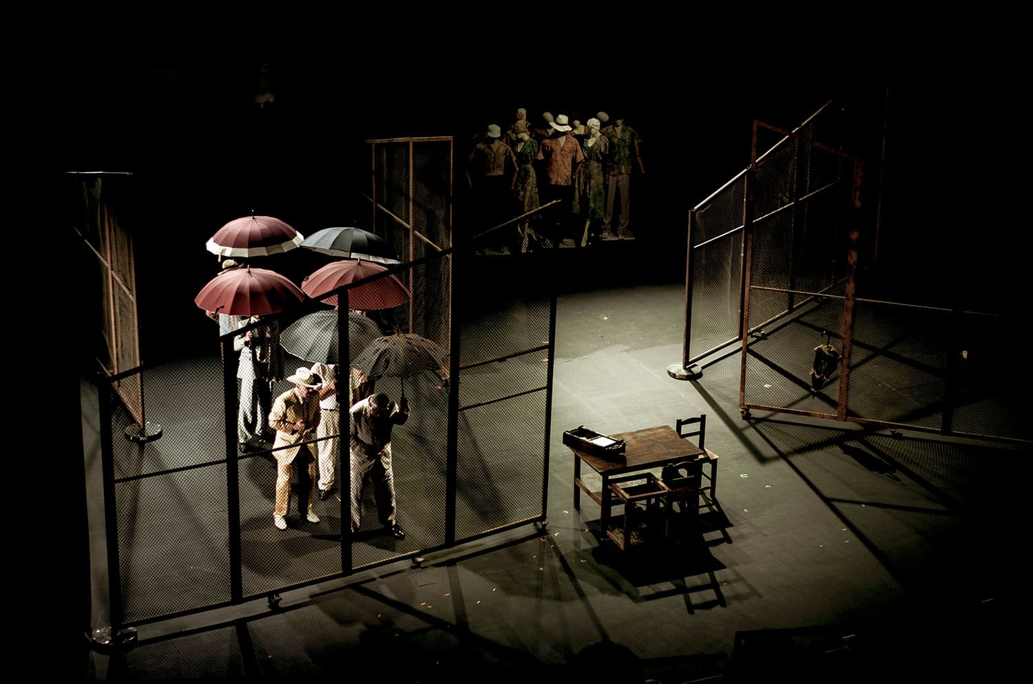 El desfile con los paraguas bajo la lluvia es la estética que resalta el teatro Colón y que nuestro lente captó con diferente perspectiva, se resalta ese ambiente de misterio recreado en la obra. El diseño del vestuario para un conglomerado urbano, muy atemporal y con acentos no solo de leve color, sino de caracteres masculinos matizados por “el paraguas para ver el firmamento”, personajes de lentes oscuros, sombreros con guiños de género western y el caracter caribe con frases lapidarias, lo que se enfatiza en la frase final… Cuando comienzan los aplausos.