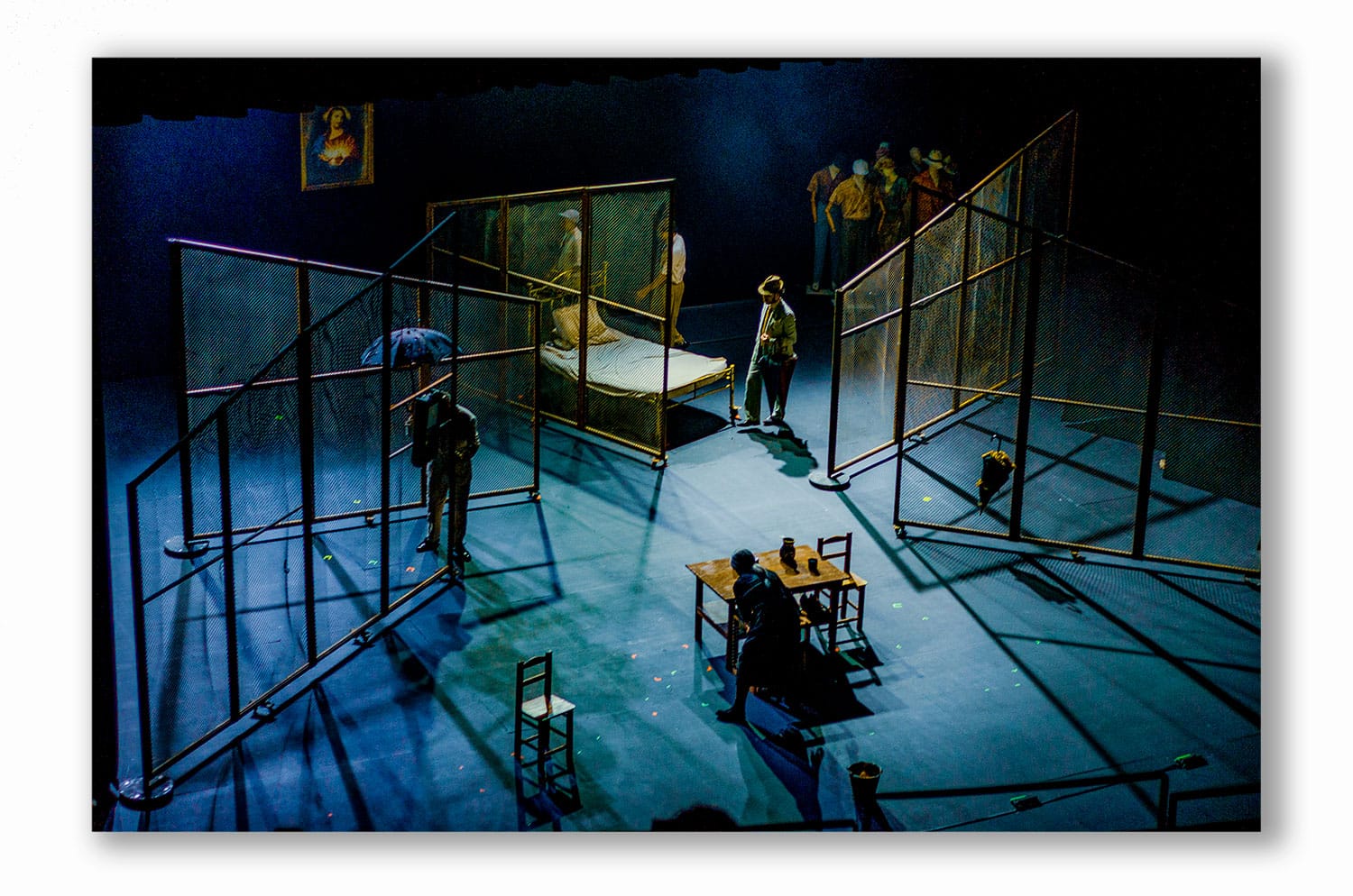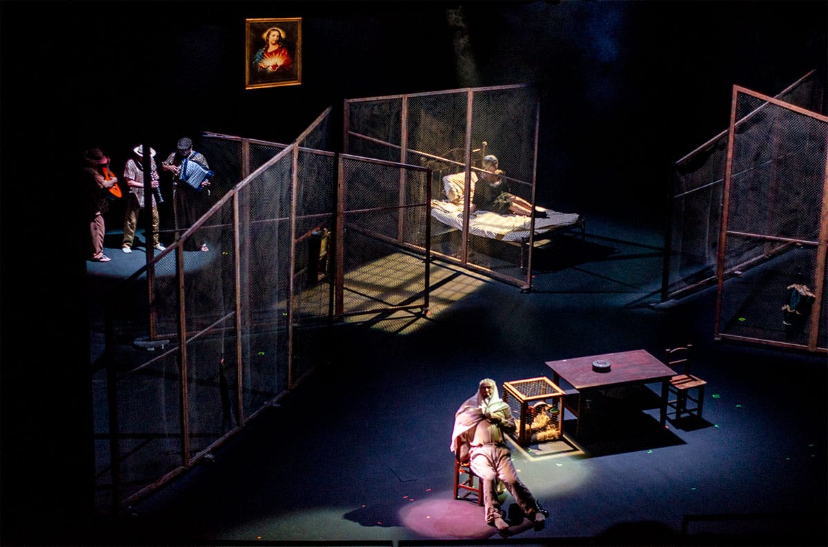 Los elementos de utilería lo enfatizan, el diseño y puesta en escena de estos, recrean callejones oscuros, y otra vez la ausencia de color en las vestimentas masculinas cuando no de lino blanco, con sombreros típicos de escena gansteril. El blanco es la vida, la ropa del Coronel, su calzado clásico de una época aristocrática. El dramático luto de la esposa -protagonizada por Laura García- y el ambiente de represión política con un toque de queda permanente, dramatiza visualmente la ya clásica soledad en los espacios macondianos. Una vida compartimentada -los módulos de escenografía, rejas que aprisionan, dependen de la iluminación del instante representado.- Ese fue el caracter que imprimió el director Jorge Alí Triana, o eso vimos fotográficamente.