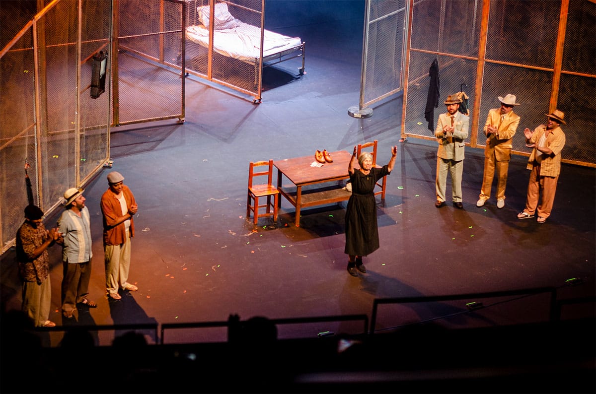 El montaje teatral de la Obra de García Márquez El coronel no tiene quien le escriba, una creación del Teatro Colón bajo la dirección del veterano director Jorge Alí Triana y adaptación de su hija Verónica con la estética faulkneriana. Eso sugiere nuestro registro fotográfico durante su única función en el Teatro Santa Marta. Montaje y presentación impecables y lo mejor: el público samario con sus aplausos para el elenco incrementados cuando aparece al final su director Jorge Alí Triana que con su gesto de la mano en el pecho lo dice todo.