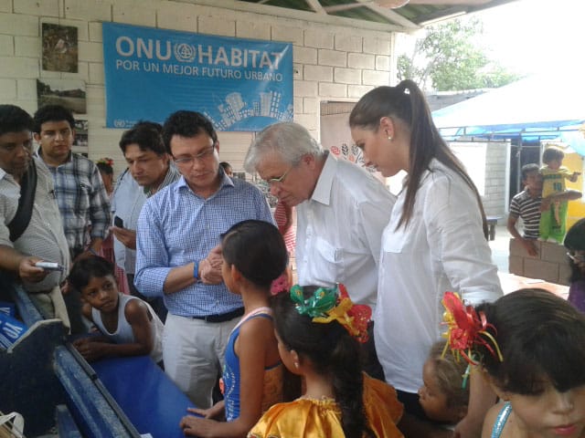 Joan Clos, Secretario General Adjunto de las Naciones Unidas y Director Ejecutivo de ONU – Habitat, el Alcalde Carlos Eduardo Caicedo, junto a Taliana Vargas, representante de la Fundación Casa en el Árbol y futura Embajadora de Buena Voluntad de ONU Habitat.