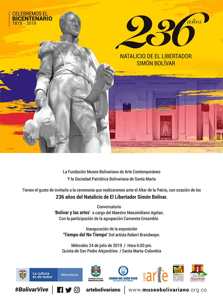 Los actos programados para la celebración de los 236 años de Simón Bolívar integran la programación cultural 2019 del Museo Bolivariano de Arte Contemporáneo proyecto apoyado por el Programa Nacional de Concertación Cultural y el Ministerio de Cultura y la Alcaldía Distrital.