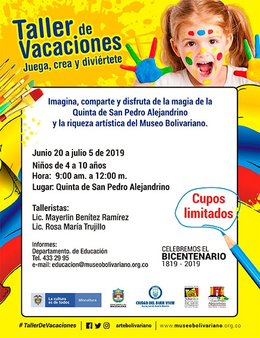 Se ofrecerá un taller con manualidades que van desde pinturas, uso de materiales reciclables y actividades recreativas. Con relación al acceso del taller explicó que es un taller con costo, que incluye los materiales a utilizar, con cupos limitados, los interesados pueden acceder a toda la información a través del número de contacto 4332995 o al correo electrónico educacion@museobolivariano.org.co